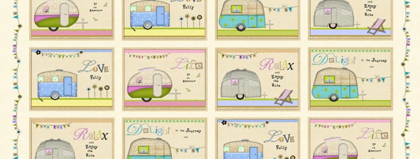 Si chiama Happy Camper e si compone di tre stampe a fiori, in colori vivaci e primaverili, e di un pannello a blocchi con camper e roulotte colorati, su sfondo crema, più una stoffa coordinata che riprende lo stesso sfondo color panna e lo arricchisce di scritte leggere e festoncini nei colori delle stoffe coordinate a fiori.