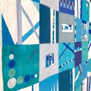 Ecco qui il nostro progetto! Un quilt (dimensioni 110 x 150 cm circa) che unisce i quattro disegni del pannello a due piastrelle realizzate in applichè, il tutto con intersezioni e dettagli in applichè che richiamano i particolari della stoffa.
