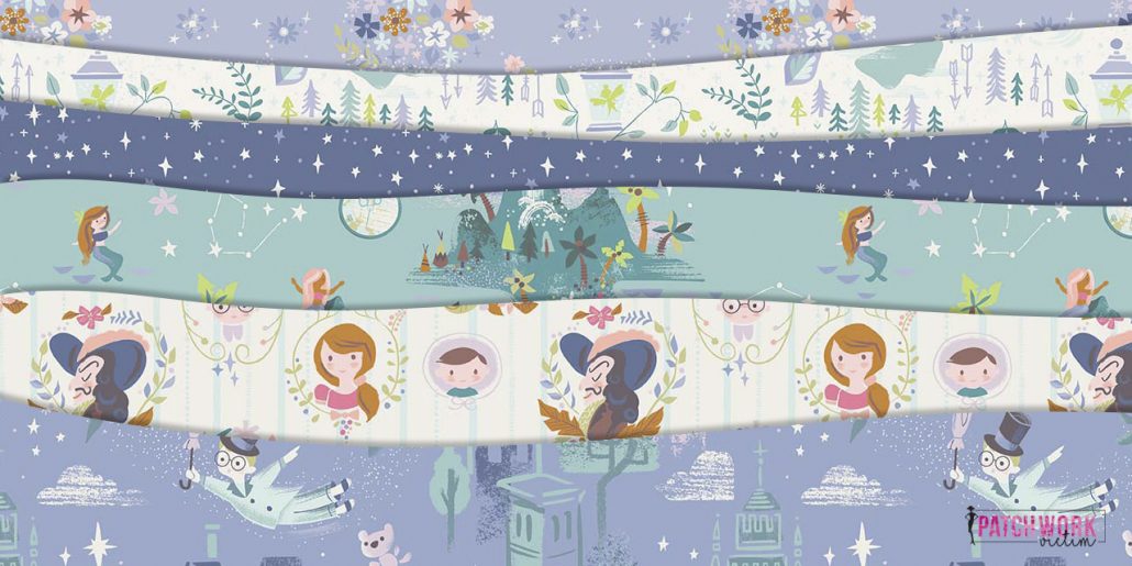 La collezione è firmata Riley Blake – una garanzia nel mondo delle stoffe da patchwork – e si chiama Neverland, come l’Isola che non c’è nell’opera originale in inglese.