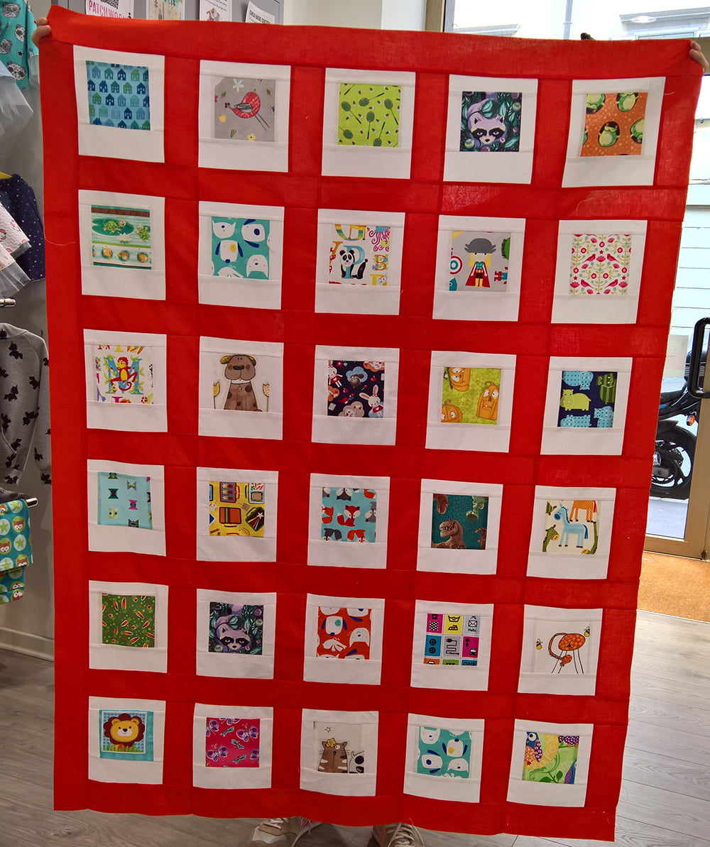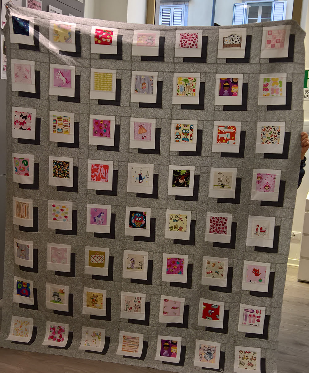 Per chi ancora non conosce questo progetto: Polaroid for Children è un’iniziativa benefica di Patchworkvictim, che ha invitato le proprie amiche e clienti a donare delle polaroid di stoffa. Ne sono arrivate circa 250, ben oltre i nostri pronostici; buona parte di queste sono state cucite, grazie anche alla sponsorizzazione della Aurifil, che ci ha donato il filato necessario, oltre a gadget e premi per chi ci ha dato una mano nell’assemblaggio, in 4 quilt, che verranno donati all’Associazione ABC Burlo Bambini chirurgici di Trieste. Il tessuto per l’assemblaggio, il retro e l’imbottitura sono stati donati dalla Torrenuvola società cooperativa sociale (a cui fa capo la nostra attività); tre longarmer (Tiziana Tomè di Officinatessile, Alessia Franco dell’Associazione Punto e Daniela Colombo) quilteranno gratuitamente i nostri quilt. Il primo è già pronto ed è bellissimo, ma per vederlo dovrete aspettare la prossima puntata!