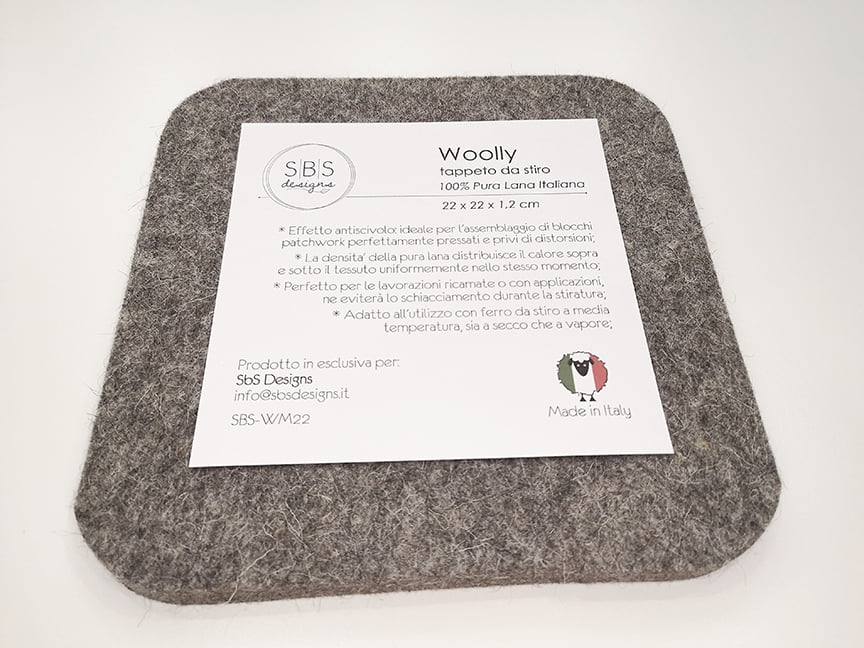 Ti stai chiedendo perchè non puoi continuare a stirare sul tuo fedele asse da stiro? Te lo spiego: la densità di Woolly permette al calore di venire distribuito contemporaneamente al di sopra ed al di sotto del tessuto, con o senza l’utilizzo del vapore, cosa che ti consentirà di ottenere blocchi perfettamente piatti come mai prima d’ora! Inoltre la superficie in lana farà sì che i blocchi non si muovano più in fase di stiratura, eliminando così il fastidioso effetto distorsione. Woolly si può utilizzare non solo per il patchwork ma anche per ricami ed applicazioni: la sua struttura compatta ma cedevole al tempo stesso accoglierà tutti i particolari in rilievo senza appiattirli.