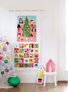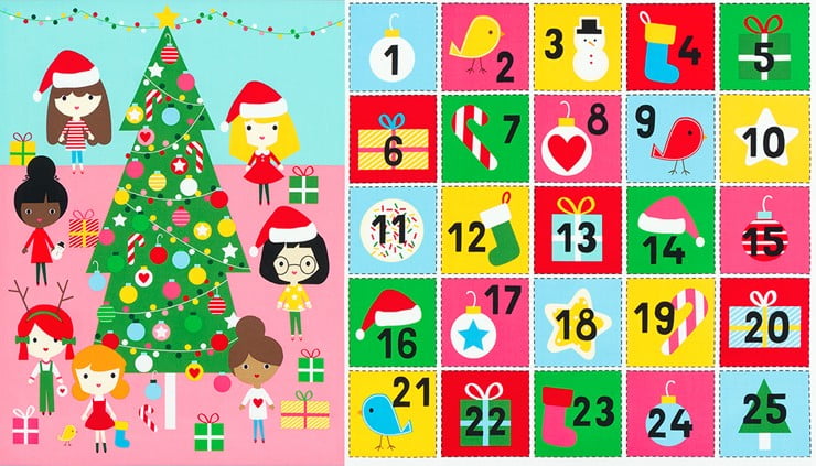 Iniziamo da una versione del calendario dell’Avvento disegnato con i colori vivaci e gioiosi di Ann Kelle: il pannello è composto da un unico disegno festoso e da 25 riquadri con cui realizzare delle tasche. Il calendario si può cucire in vari modi, aggiungendo delle tinte unite o dei tessuti coordinati. Ecco un esempio: