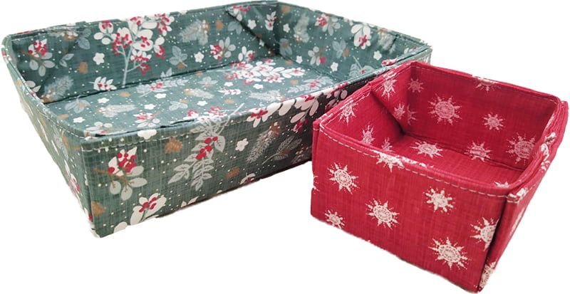 Queste scatoline in due diverse misure sono facili e veloci da realizzare e possono essere declinate in moltissimi modi: perfette come regalo di Natale, possibilmente piene di cioccolatini (o, perché no, stoffe), pratiche nella craft room per raccogliere rocchetti, spoletti, piedini e mollette, utili in bagno per tenere in ordine i vostri prodotti di bellezza, i campioncini delle profumerie o i dischetti struccanti. Ma scegliete la stoffa giusta e saranno perfetti in cucina (piene di spezie!), sulla scrivania dell’ufficio (elastici, graffette e biglietti da visita) o nei disordinati cassetti dei vostri figli.