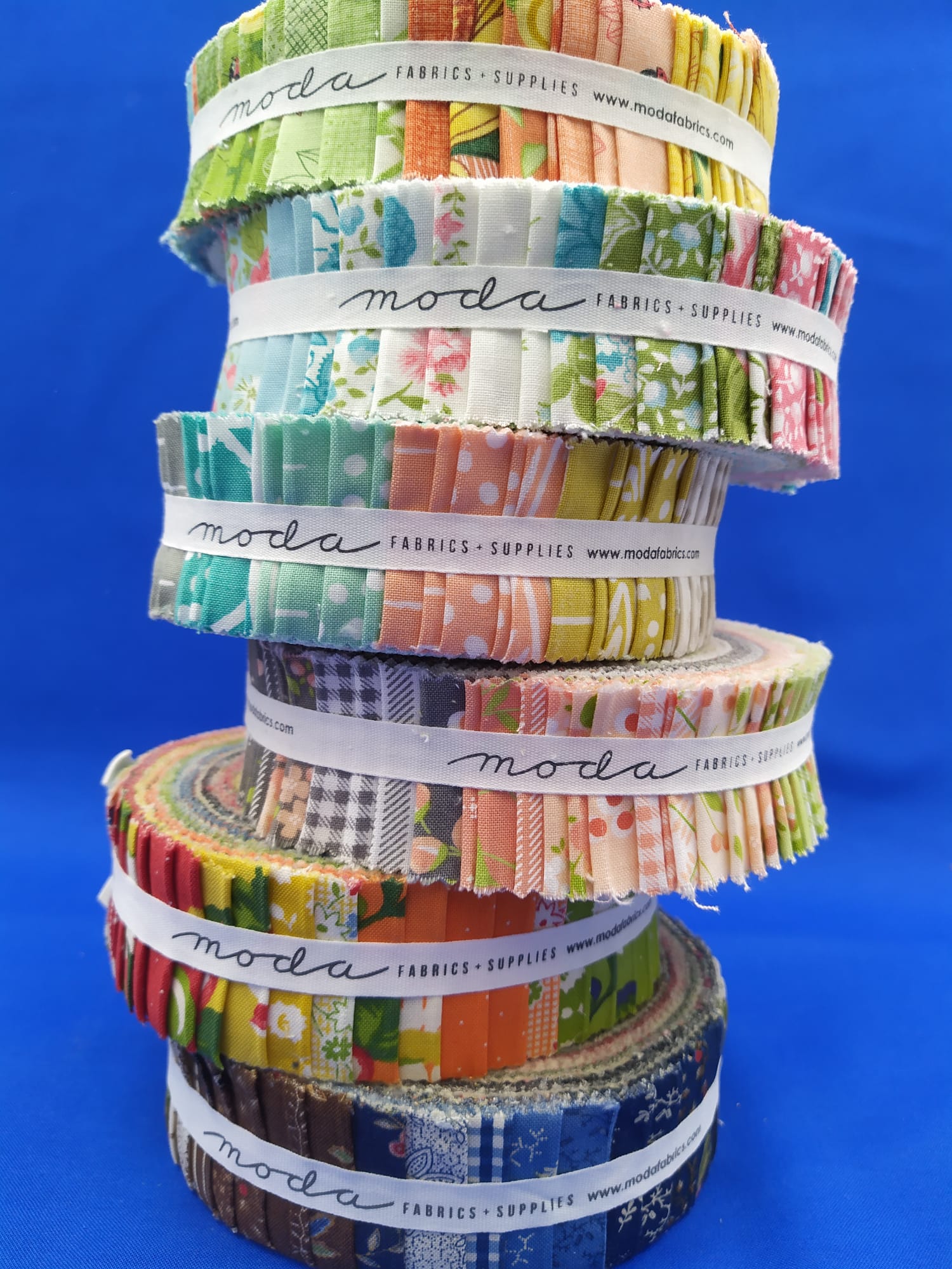 Ma dove sono nati i jelly roll? Forse non tutti sanno che “jelly roll” è un marchio registrato di Moda Fabrics: i loro rotoli da 40 strisce creati attingendo alle singole collezioni dei molti designer hanno avuto così tanto successo da entrare nel linguaggio comune delle quilters (possiamo dire che è stato un po’ come la Nutella? Sul serio, chi la chiama “crema spalmabile alle nocciole”?).