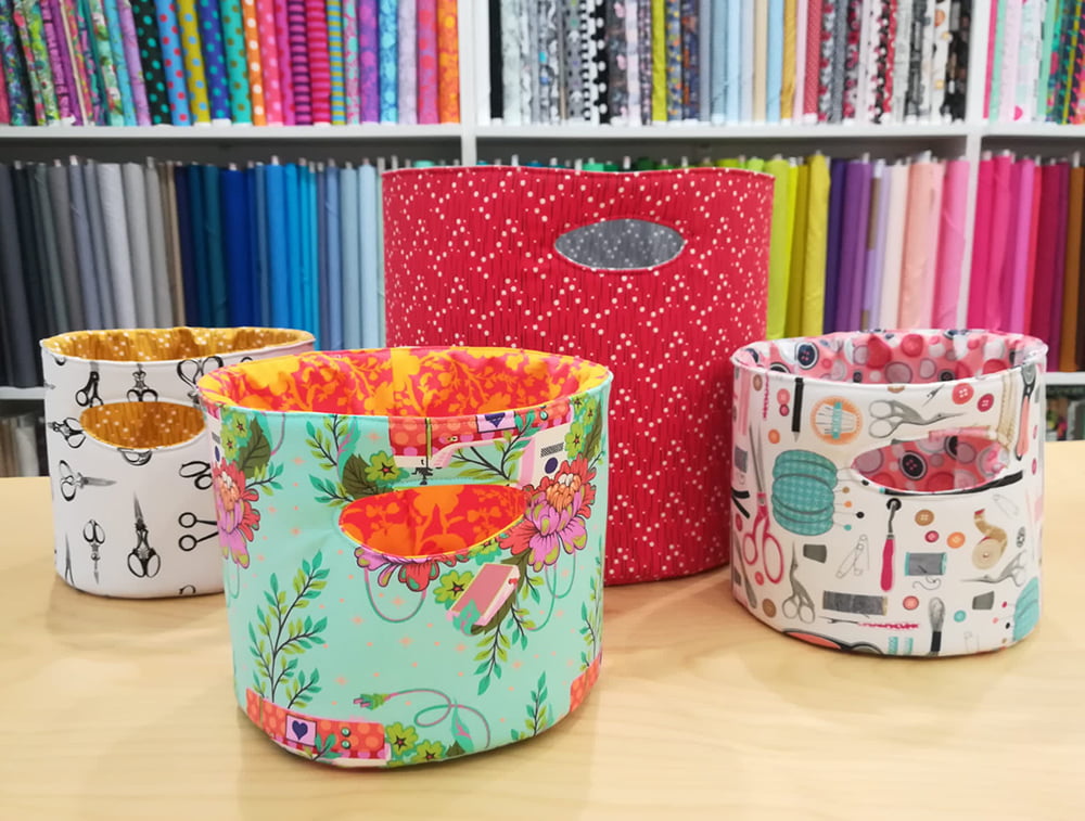 Tutti i passaggi per realizzare i cestini sono spiegati nel tutorial. Se hai bisogno del materiale sul nostro sito trovi stoffe a volontà, oltre agli stabilizzatori.