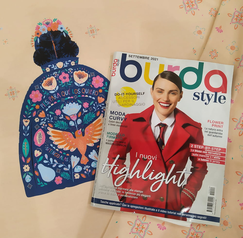 - Burda Style, edizione settembre 2021; il modello è il 102 (abbiamo solo accorciato un po’ le maniche). Taglie dalla 38 alla 44; sostituendo la mezza manica alla manica lunga, il pannello che abbiamo utilizzato è sufficiente anche per la taglia 44.