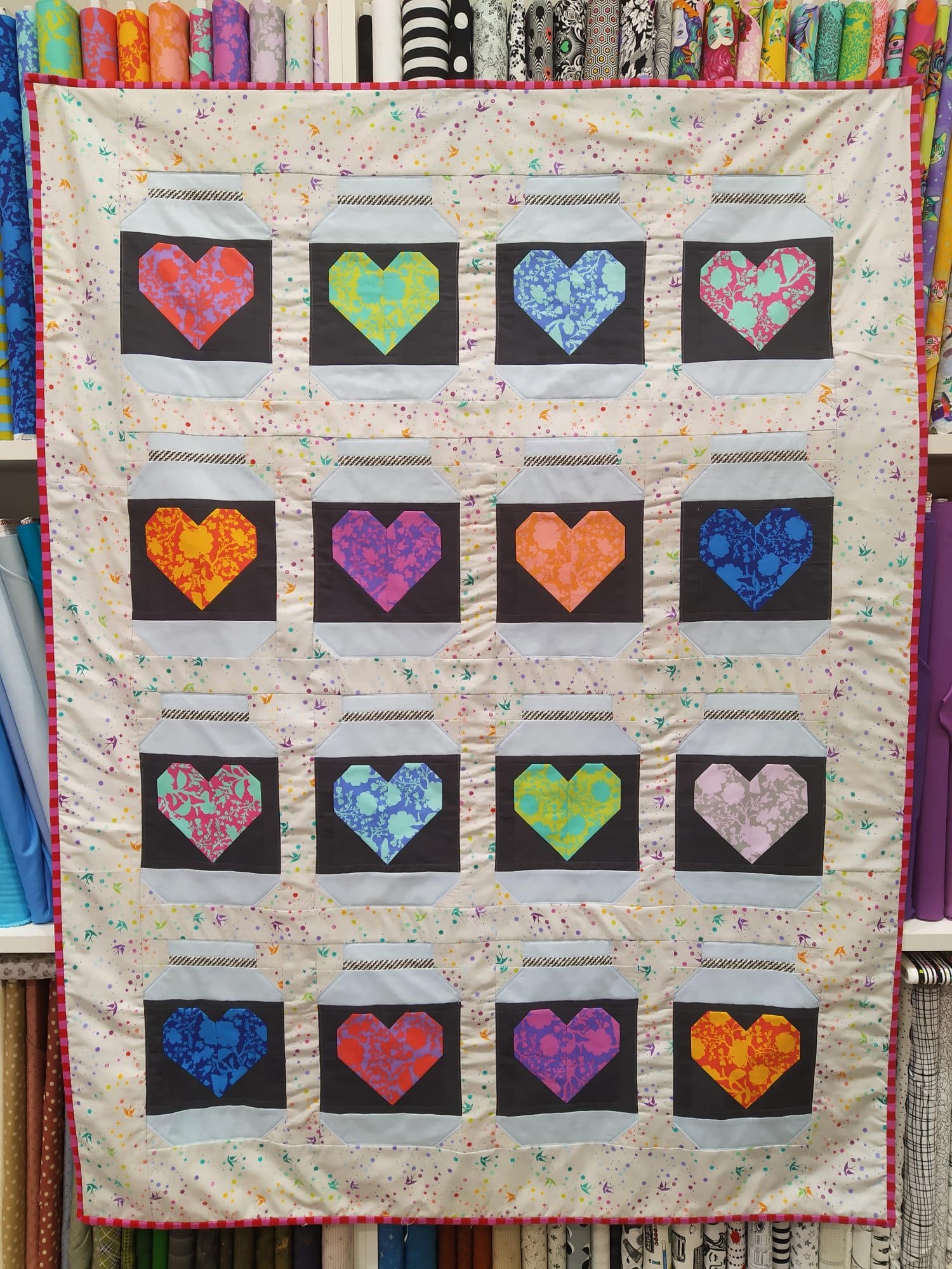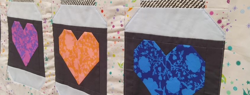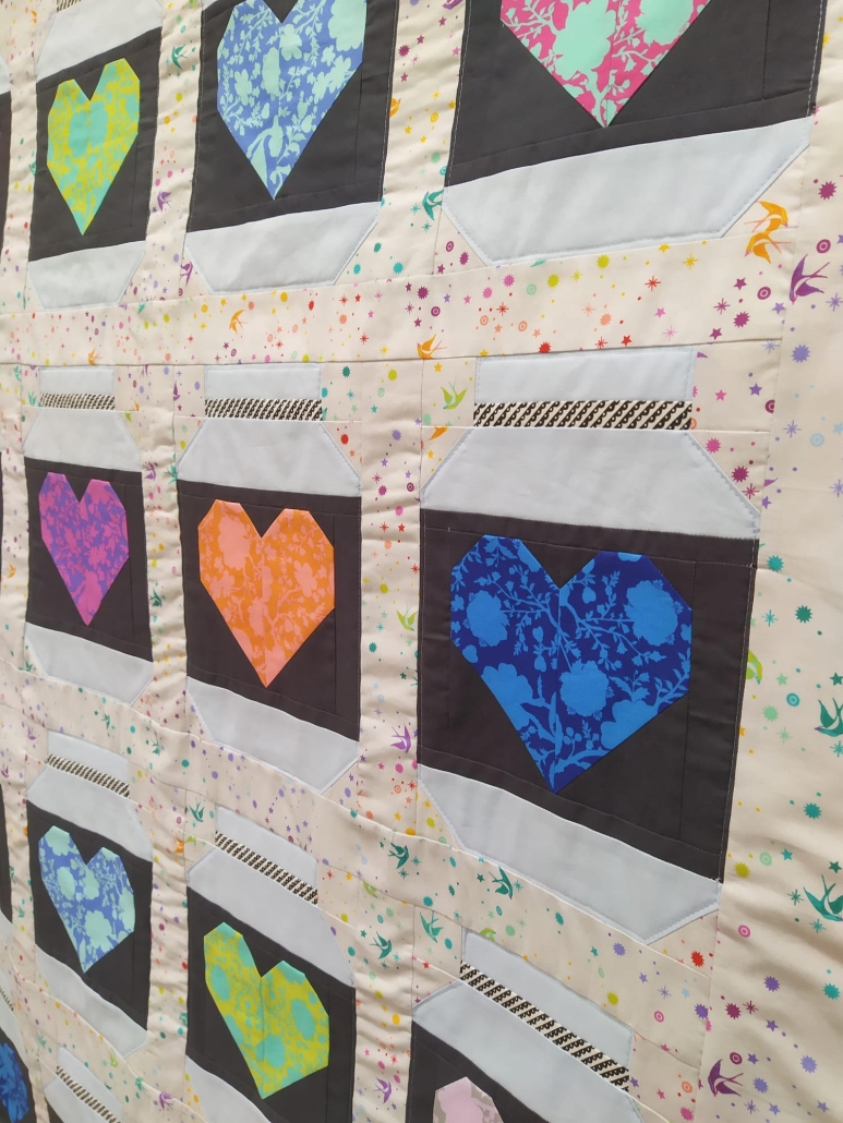 I blocchi possono avere i cuori tutti uguali o tutti diversi, a seconda di quanti colori deciderai di utilizzare: noi con 16 blocchi disposti in 4 file da 4 abbiamo realizzato un quilt da 118 x 156 cm circa. Come tessuto per la base e per i cuori abbiamo attinto alla collezione “True Colors” di Tula Pink, mentre per il barattolo e la sua etichetta abbiamo scelto delle tinte unite Kona Cotton, ma anche in questo caso le possibili combinazioni sono tantissime, dipende dal tuo stile, dall’arredamento della tua casa o dai gusti della persona a cui desideri regalarla.