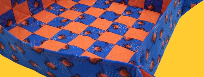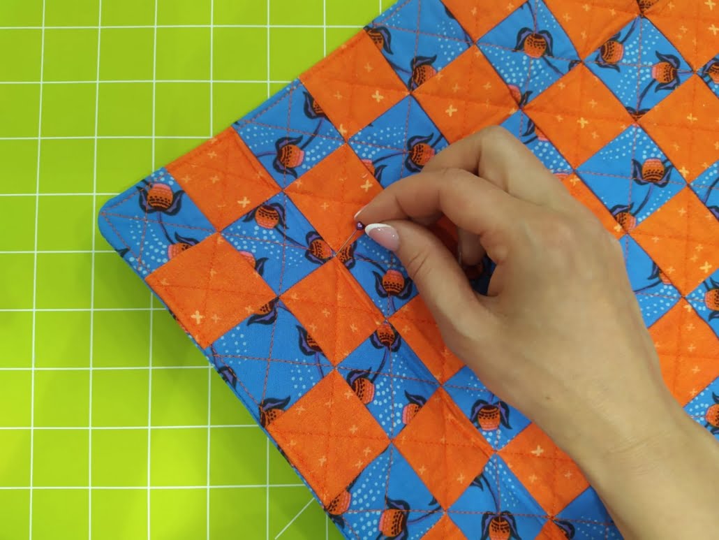 Inizia tagliando 121 quadratini da 2″, metà di un tessuto, metà dell’altro. Disponili sulla Quilters grid, stirali e cucili seguendo le indicazioni del tutorial dedicato; quindi ricava un quadrato di Legacy 973 della stessa misura del pannello che hai appena cucito e adesivalo stirandolo sul retro. Quilta il pannello a piacere: io ho scelto una quiltatura in diagonale e il nastro adesivo per trapunto mi ha aiutato ad andare dritta. Completata la quiltatura ricava dal fat quarter un quadrato della stessa dimensione del pannello, posizionali dritto contro dritto e cuci tutto intorno con margine patchwork (1/4″) lasciando un’apertura di circa 12 cm. Taglia via gli angolini, risvolta, dai la forma agli angoli aiutandoti con un bastoncino, stira bene e fai una ribattitura tutto introno e 2 mm dal bordo, chiudendo così anche l’apertura.