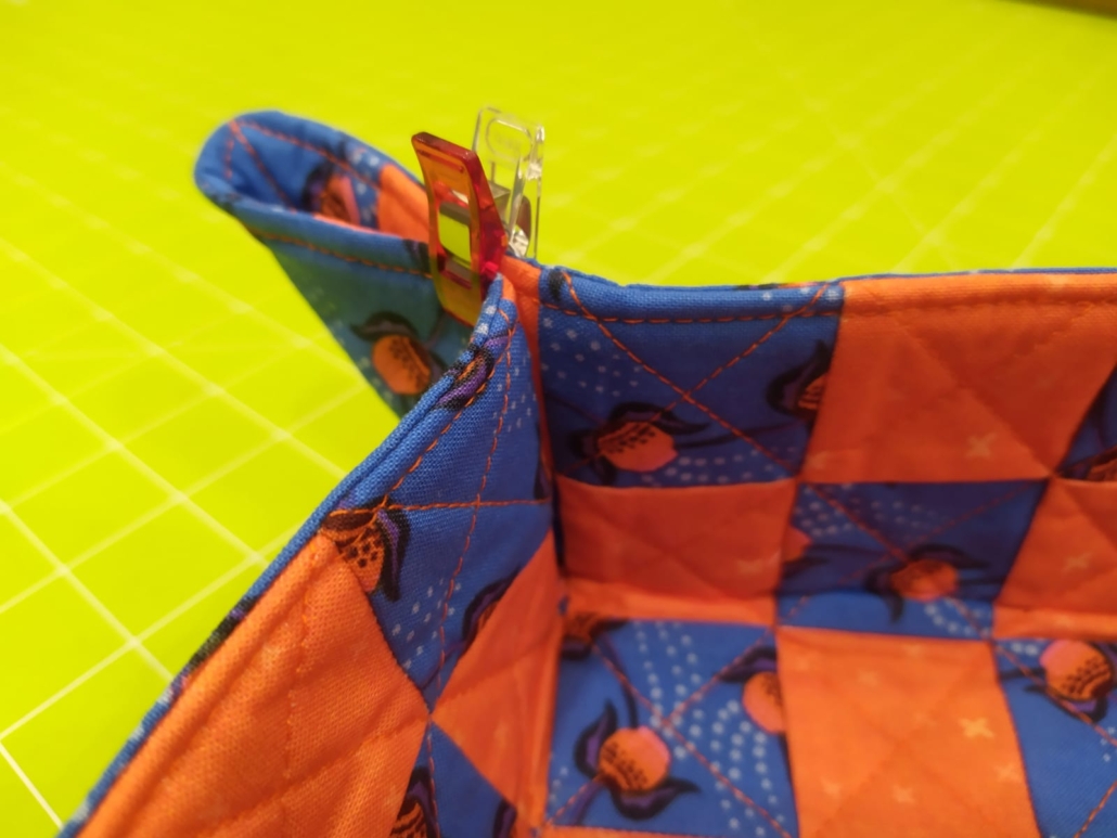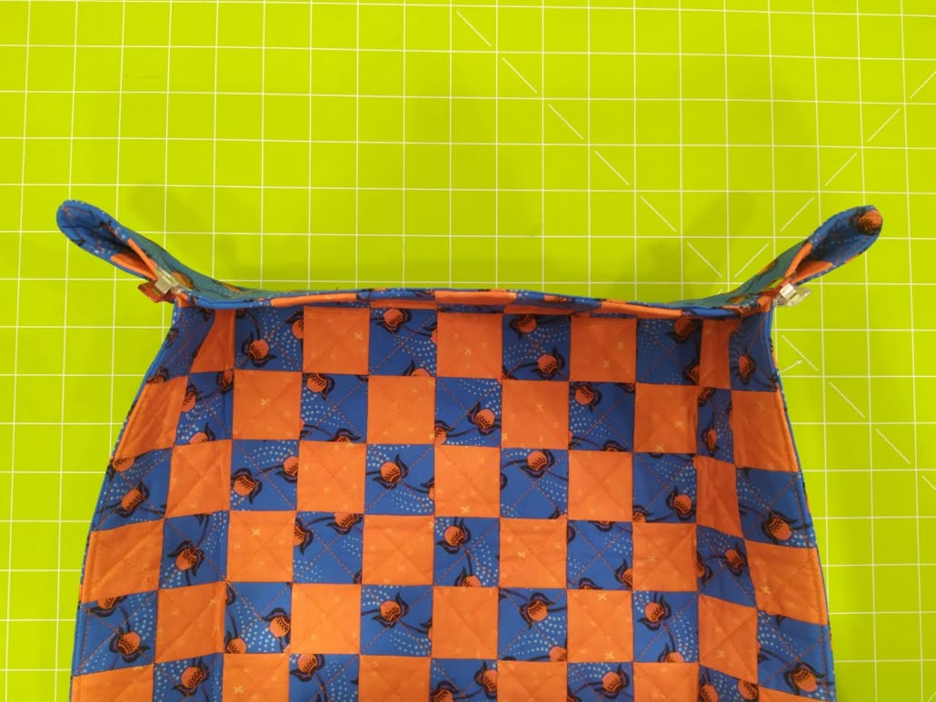 Lavoriamo sugli angoli: io ho deciso di dare al cestino una profondità di circa 7,5 cm, ma puoi scegliere di fare diversamente. Ti spiego come ho fatto io: piega ciascun bordo verso l’interno sulla seconda fila di quadrati e stira, in modo da dare già la forma al cestino. Questo è il risultato che voglio ottenere: