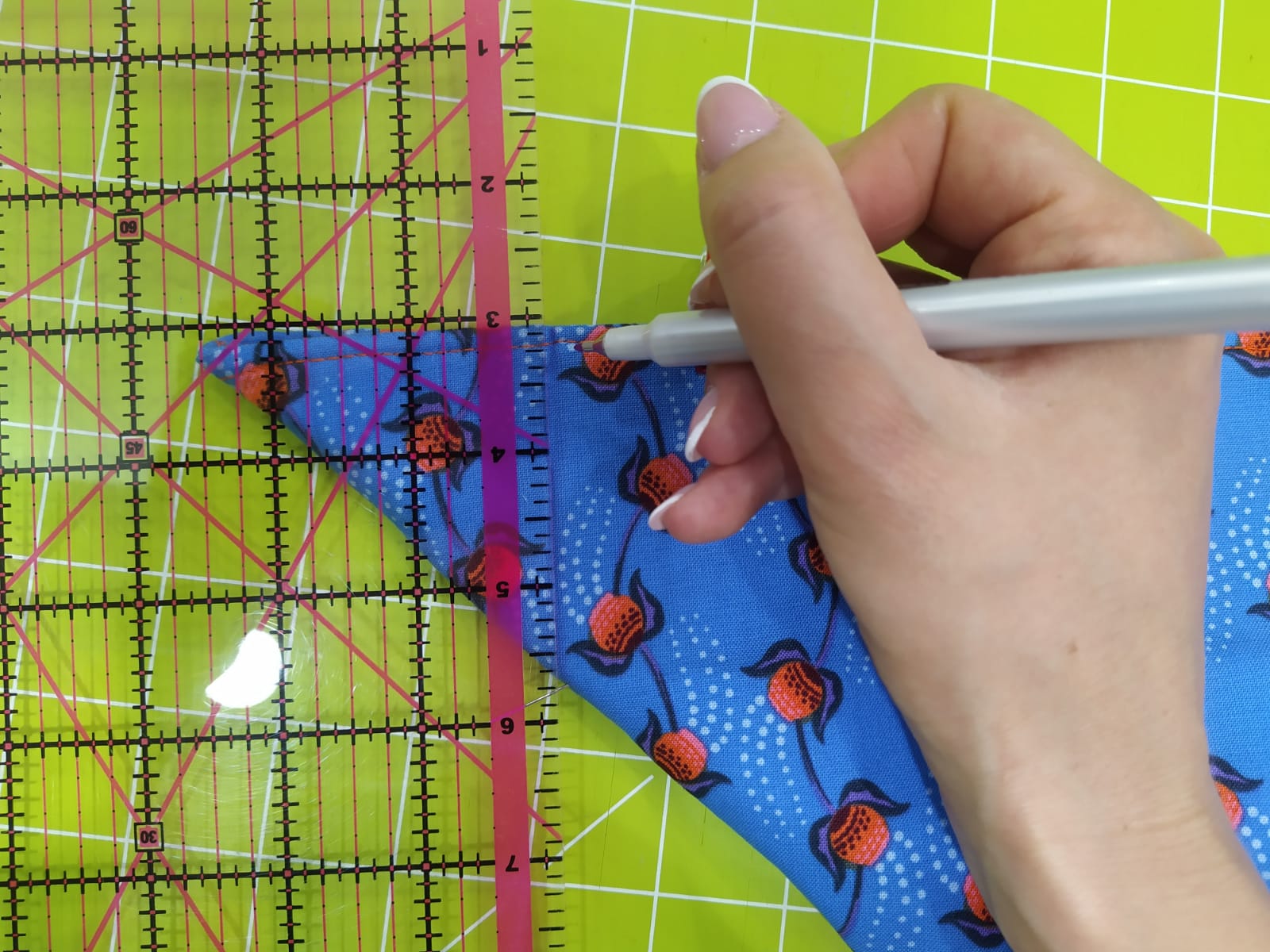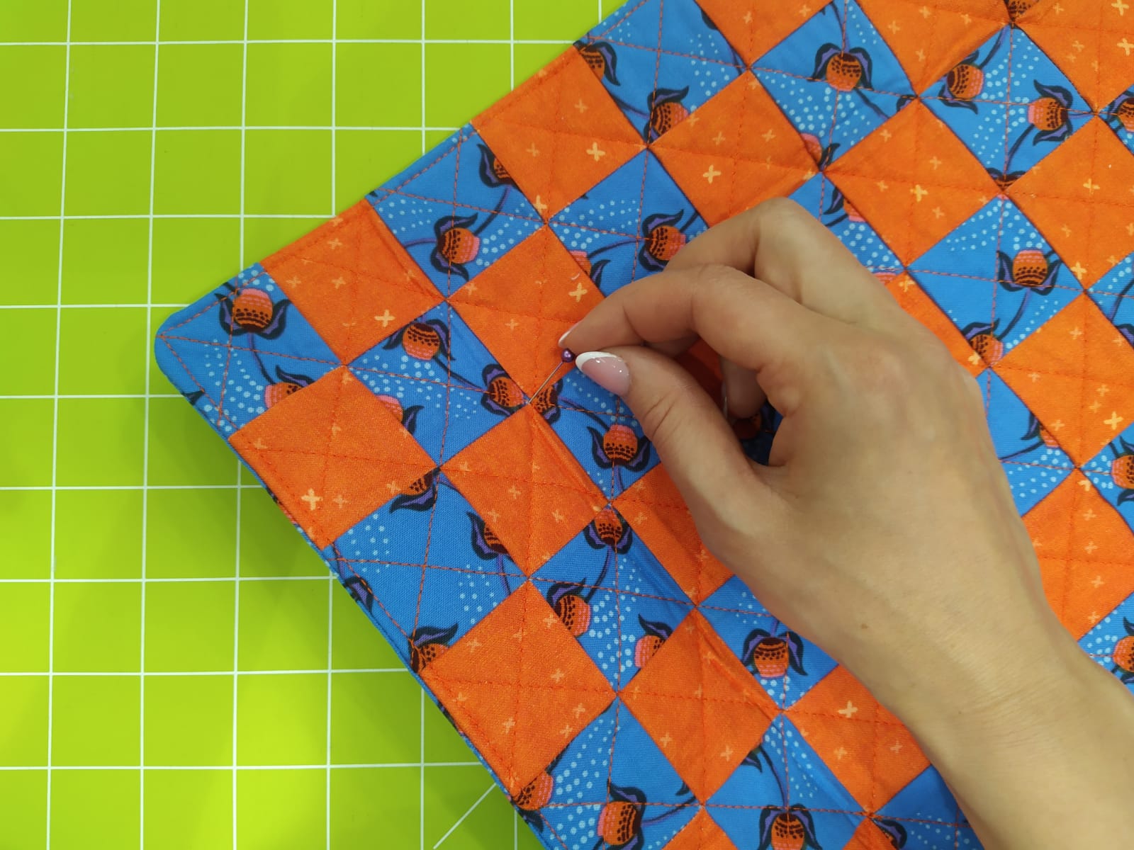 Traccia una riga con un marcatore per tessuti facendola partire dalla fine del secondo quadrato e finire nel punto in cui esce lo spillo. Fai una cucitura lungo la riga segnata saldando bene inizio e fine.