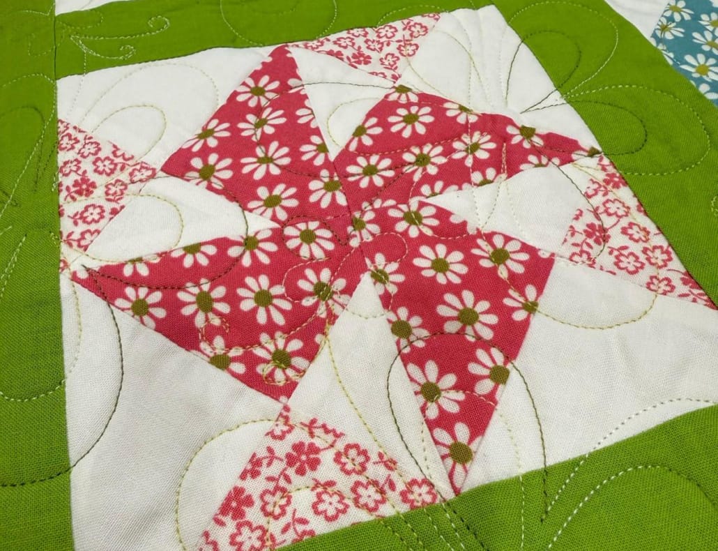 Ciao amiche ed amici di Patchworkvictim, oggi voglio parlarvi di un quilt che ho amato molto e che finalmente ora fa bella mostra di sè nella vetrina del negozio. L’ho iniziato nella primavera del 2021, in un periodo difficile a causa della pandemia; avevo trovato questo bellissimo progetto free realizzato da Nadra di Ellis & Higgs, un assortimento di tessuti che non vedevo l’ora di usare e mi sono buttata, ho fatto i miei primi tutorial patchwork, li registravo a casa e li caricavo sul nostro gruppo Facebook Patchwork Village (li trovate ancora!). Diverse amiche mi hanno fatto compagnia in quest’avventura ed ho visto nascere dei quilt meravigliosi. Io mi sono fermata a pochi blocchi dalla fine, travolta da altre iniziative e solo lo scorso anno ho trovato le energie per rimetterci mano e portarlo alla fine, grazie anche alla magistrale quiltatura di Tiziana Tomè.