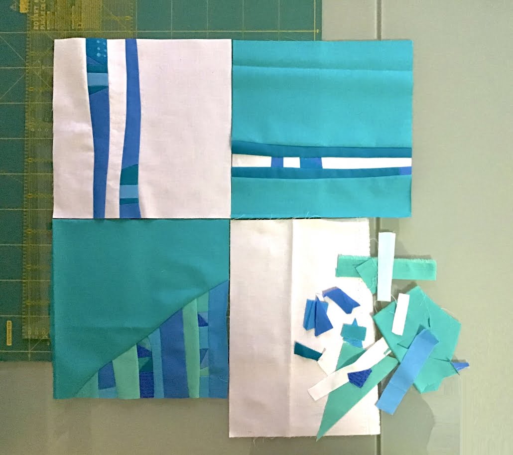 - cuci il tuo blocco seguendo queste semplici regole: dimensione di 25 x 25 cm, sfondo in tinta unita, stile minimalista improv (nel video Paola mostra alcuni esempi e da dei consigli su come realizzarli); per avere un’armonia nel progetto, ti chiediamo di utilizzare tessuti azzurri e bianchi, per la maggior parte solidi;